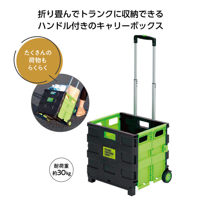 折り畳んでトランクに収納できるハンドル付きのキャリーボックスが、「折りたたみコンテナキャリーM 二層構造」です。耐荷重30kgなので、重たい食材やキャンプ用品を持ち運ぶのに役立ちます。折り畳めばコンパクトになり、車のトランクに常備しても邪魔になりません。アウトドアイベントの抽選景品や、展示会の記念品などにいかがでしょうか。当店では格安のお値段で販売しておりますので、お気軽にご注文下さいませ。