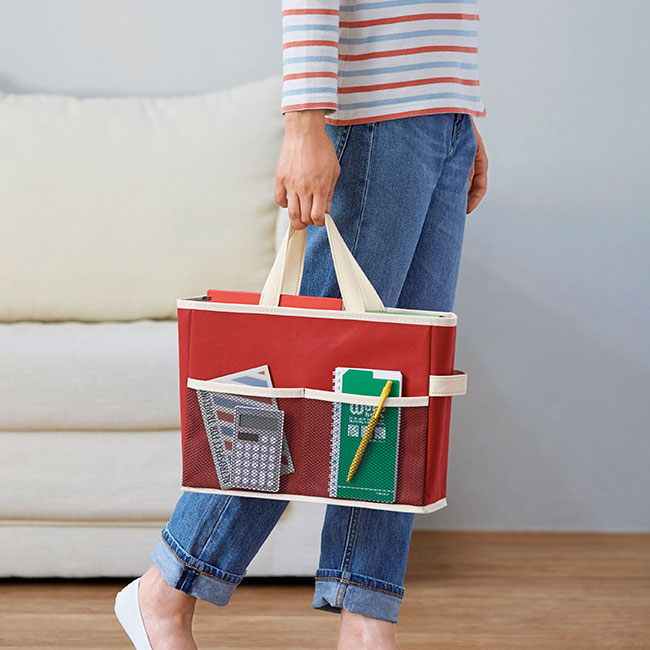 お部屋や仕事場の空きスペースを有効活用できるおしゃれな収納ボックス「収納ボックスバッグ」小物類の収納に便利なサイドポケットやボックスの場所を変えるときも持ち手が付いているので楽に運ぶことが出来、どんな場所にも合うシンプルなデザインも使いやすさのポイントです。