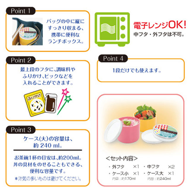 バッグの中にすっきる収まる多々型のランチボックスが、「ツリーランチボックス(2段)」です。容量約170mlの上段にはおかず、容量約240mlの下段にはご飯を分けて入れることができ、最上段のフタには調味料やふりかけの収納スペースも付いています。カラフルなランチボックスは、最上段のフタに可愛らしいフルカラーイラストを印刷することで学生やOL層にアピールできるノベルティになります。キャラクターショップやアパレルブランドのノベルティとしての格安名入れ製作は、当店にお任せ下さいませ。