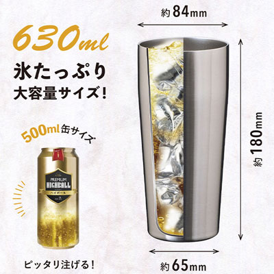 500mlのハイボール缶もピッタリ注げる、大容量タンブラーです。容量はたっぷり630mlあるので、ハイボールやサワー、水割りなどをたっぷり楽しむことができます。自宅に置いておく、晩酌アイテムとして活躍します。