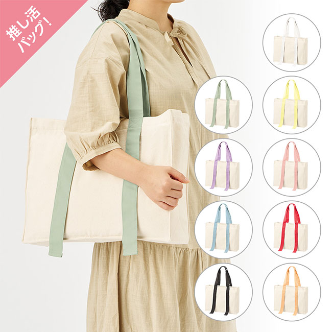 カラフルなリボンのような長いハンドルが可愛らしい「キャンバスカラーハンドルスクエアキャリーオントート」。1~2泊分の着替えが入るほどの大きさと、スーツケースのハンドル部分に付けられる仕様は旅行やライブの遠征に重宝します。多彩なカラーバリエーションは推し活グッズのオリジナル制作に好評で、アーティストロゴやキャラクターイラストなどのフルカラープリントも発注可能です。アイドルショップのノベルティやコンサートグッズの激安オーダーメイドにお薦めです。