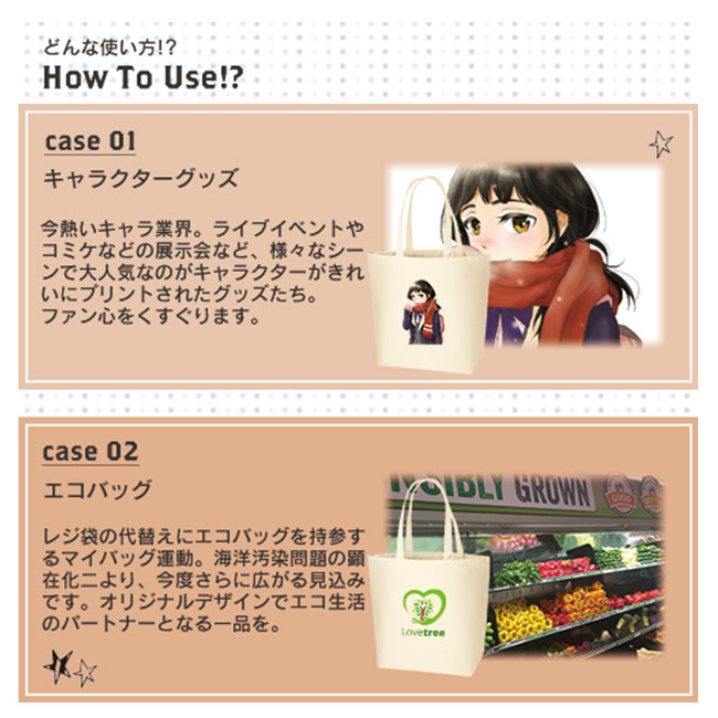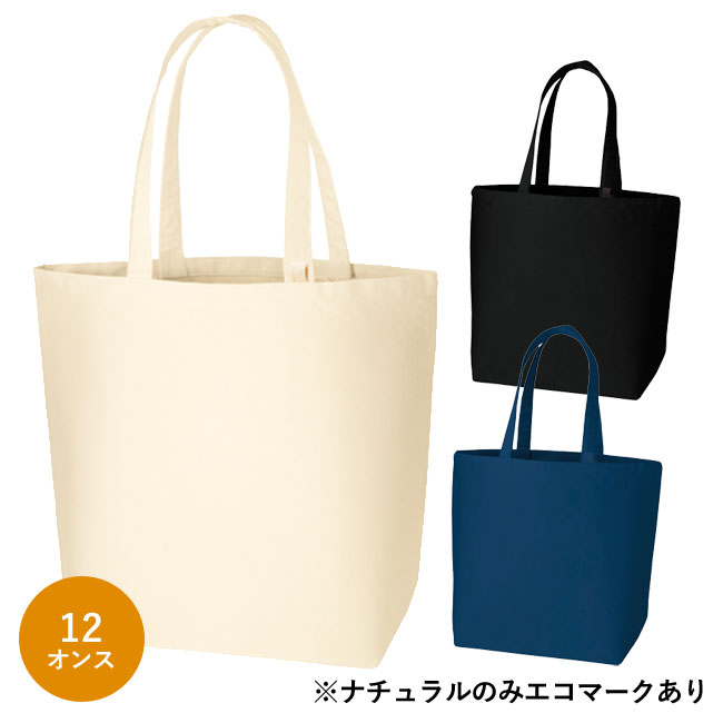「キャンバストート(L)インナーポケット付」は約12オンスの生地で製作されたトートバッグで表面が美しくデザインプリントも綺麗に映えますので訴求力の高い仕上がりになります。記念品や物販など品質が重視されるオリジナルバッグ制作にオススメしたい良品です。