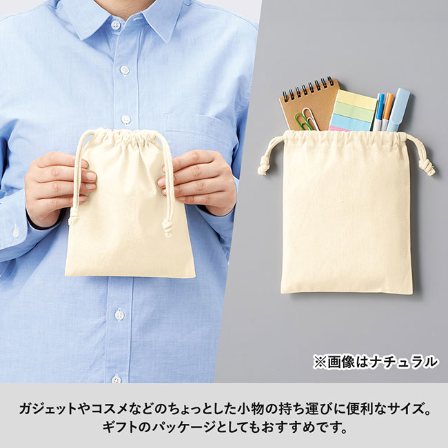 「コットン巾着(S)」は、小ぶりなサイズ感が使い勝手の良いコットン巾着になります。SSサイズよりも大きくMサイズよりも小さいSサイズは、ガジェットやコスメを入れた持ち歩き用ポーチにもぴったり。ベーシックなデザインは使う人や用途を選ばず、物販からギフトラッピングまで様々なオリジナル製作にご活用いただけます。格安価格の本体にはフルカラープリントも承りますので、当店でのオーダーメイド注文をぜひご検討下さいませ。