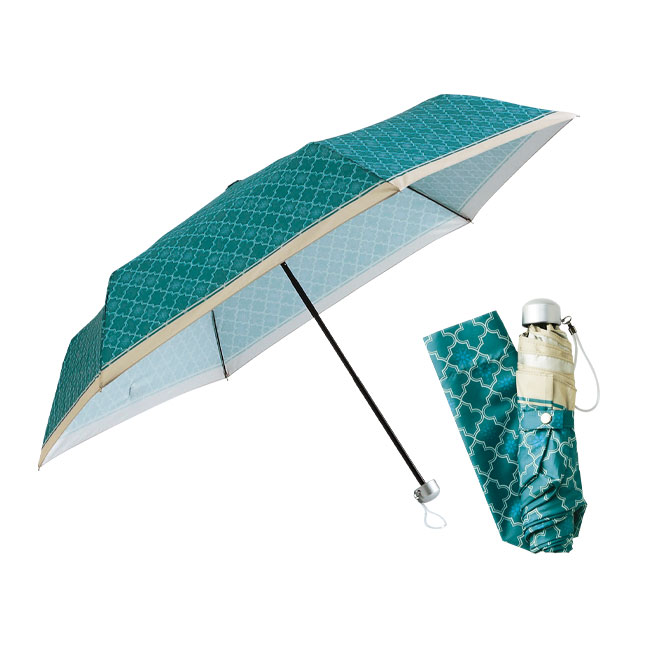 「モロッカン・晴雨兼用折りたたみ傘」は、柄×柄の組み合わせと鮮やかなグリーンを使ったこだわりアイテム。折りたたみタイプは収納袋も同じ柄となり、たたんだ状態でもおしゃれに持ち歩けます。持ち手のシルバーも高級感ある仕上がりです。