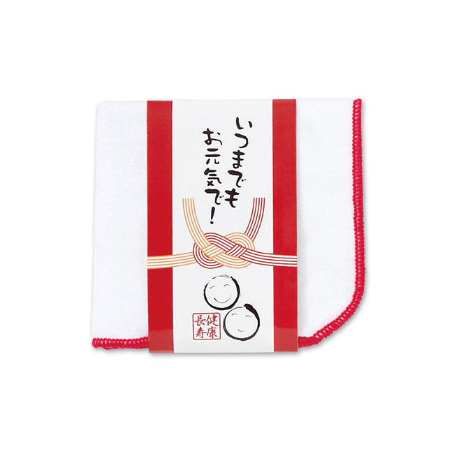 「いつまでもお元気で!」のメッセージ入りのデザインがほっこりかわいい「健康長寿ハンドタオル」。携帯に便利な200×200mmサイズのハンドタオルなので実用性抜群で、シニア向けのノベルティにお薦めです。のし袋風の紙帯巻きデザインの包装でギフト感も◎。シニア向けの地域イベント参加ノベルティや、病院関連の周年記念品などにぜひご活用ください。激安価格で販売しておりますので、大ロット制作に最適です。