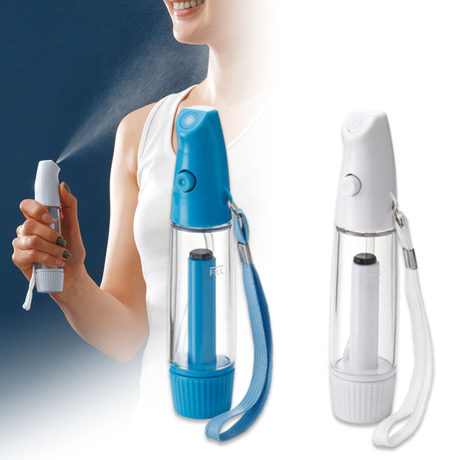 「マイクロミストシャワー」は、手動ポンプ式なので電池不要で使えるクールアイテム。キャップを外して水を入れ、ポンプを30回程押して空気を圧縮し、噴射ボタンを押すとミストが噴射される仕組みです。いつでもどこでも夏場の火照ったお肌をひんやりクールダウン。普段のお買い物バッグは勿論、ビーチバッグや車のグローブボックスにも入るコンパクトサイズなので持ち運びに便利です。企業名などを特注印刷してノベルティ制作にご活用下さい。
