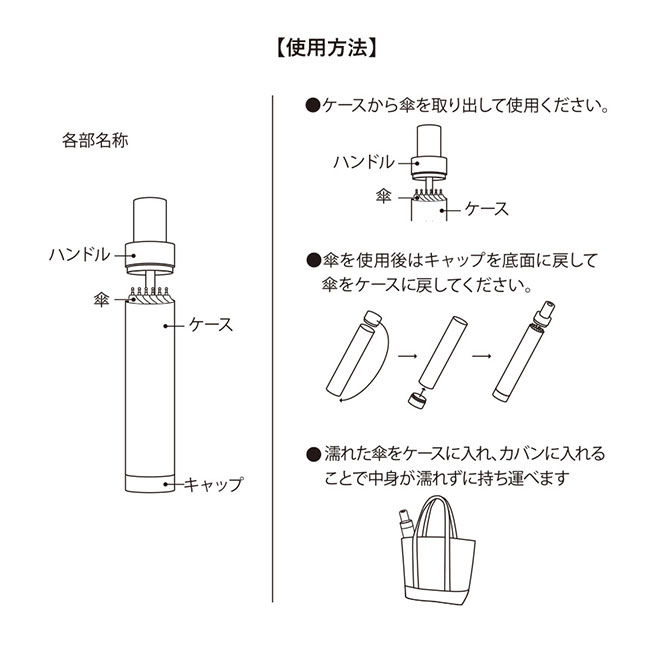 いつものバッグに常備したくなる機能的な折り畳み傘が、「ITSUMOスリムボトル折りたたみ傘 LIGHT」です。傘とケースを合わせてもバナナ1本分の軽さしかなく、ケースは防水なのでバッグが濡れる心配もありません。UVカット機能付きの晴雨両用なので、毎日使えます。ケースの名入れはワンポイントの印刷も総柄の印刷も可能です。雑貨店のオリジナルグッズ製作や、アパレルショップの記念品におすすめ。