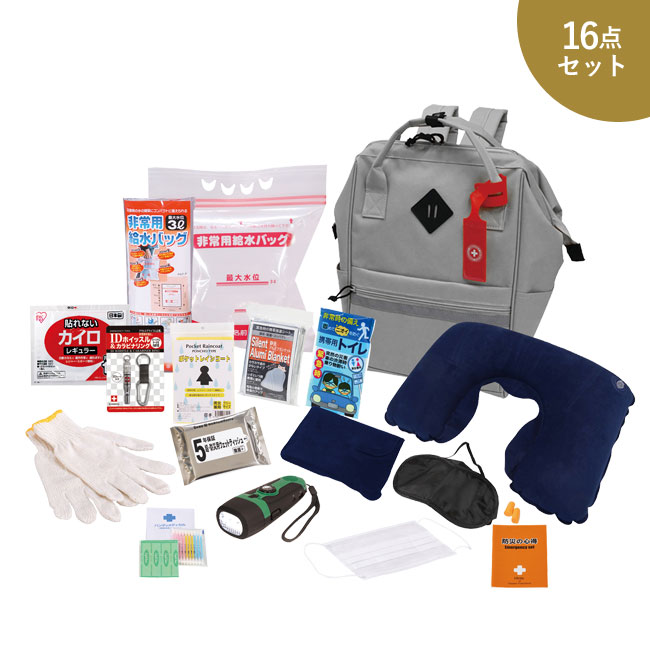- 収納リュック・静音アルミブランケット・給水袋3L・IDホイッスル&カラビナリング・レインコート・軍手・ウェットティッシュ・マスク・カイロ・携帯用トイレ1P・ネックピロー・アイマスク・耳栓・ダイナモ充電式多機能ライト・綿棒&バンソウコウ・防災の心得