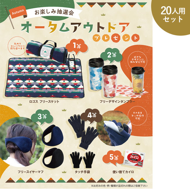 「オータムアウトドアプレゼント20人用」は、アウトドアに便利なあったかグッズが20人に当たるお楽しみ抽選会セット。おしゃれなフリースブランケットやデザインタンブラー、イヤーマフやスマホ対応手袋など、アウトドア好きにうれしいグッズを集めました。商店街や地域の秋祭り、アウトドアショップのキャンペーンイベントなど、秋の行楽シーズンのノベルティとして格安注文を承ります。