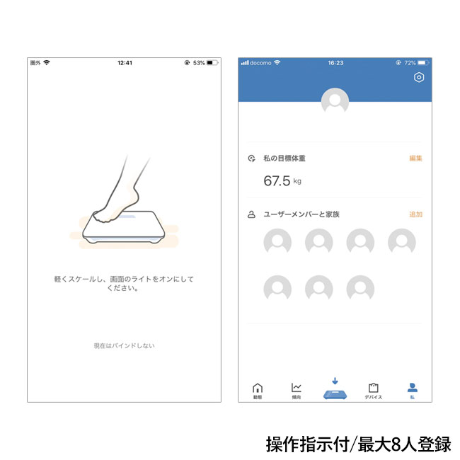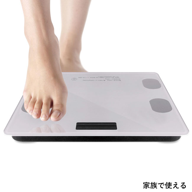 「スマホ連動体組成計 エブリィスキャン(N)」は、スマホのアプリと連携させてボディバランスを管理できる体重計になります。計測データは最大8人まで登録可能で、体重やBMIなど8種類のデータ変化を家族がそれぞれ管理できるのが便利。ガラストップの白いスタイリッシュなデザインは、インテリアに馴染みやすく生活感を抑えられるのもポイントです。ジムの入会記念品、抽選会の景品などに喜ばれますので、ぜひ当店ならではの格安発注をご利用下さい。