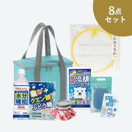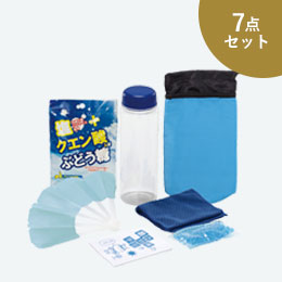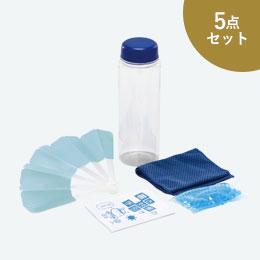 - 涼感タオル・カラビナ付給水ドリンクバッグ・おりたたみうちわ・暑さ対策の手引き×各1