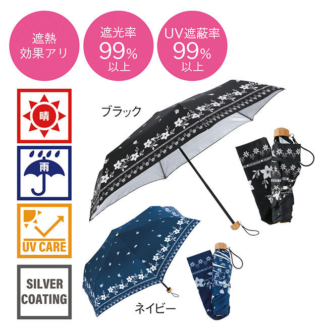 「フラワーリース・晴雨兼用折りたたみ傘」は、ベーシックカラーの傘にシンプルな花をあしらったエレガントな折り畳み傘。リースのように連なった花柄が女性らしさを演出します。UV遮蔽率99%以上で、遮熱効果もある傘ですので機能性も抜群。女性向けショップのポイント特典ノベルティや開店記念品など、プレミアム感のあるギフトにいかがでしょうか。通販ならではの格安価格で発注致します。