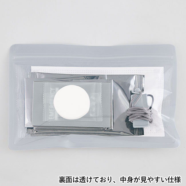 アルミブランケットや圧縮タオルなど、防災時に役立つアイテムが7点入っているのにこのコンパクトさ。透明なジッパーケースに入っているため、中身がすぐにわかるのでバッグの中でも迷子になりません。フラットな形状なのでバッグに入れてもかさばらず、通勤・買い物用のバッグに常備できる手軽さがポイント。イベントで配布するときも、来場者にサッと渡せます。