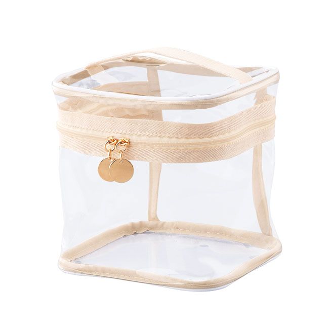 「ピュアナ・クリアバニティポーチ」は、収納力に優れたバニティタイプの透明ポーチ。コスメグッズやケア用品のボトルなどを入れるのに最適で、お部屋の収納にも便利な商品です。ベージュの縁取りやファスナーの引き手デザインもおしゃれで、女性向けのノベルティポーチ製作にぴったり。ワンポイント名入れにも対応しておりますので、コスメの購入ノベルティや女性向けサービスの入会記念品などにぜひご活用ください。