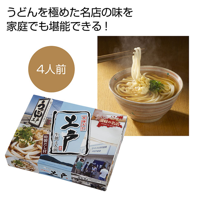 香川の名店「上戸うどん」の味を再現した「香川の名店 上戸うどん4人前」。特製だしつゆとうどんのボリュームのあるセットで、4人前作ることができます。本格的な名店の味をご家庭で楽しめるセットは、ファミリー向けの販促ノベルティに特にお薦め。商業施設のイベント記念品や、不動産などの限定キャンペーンにいかがでしょうか。当ノベルティ・ギフトモールでは、激安の値段でご注文を承っております。