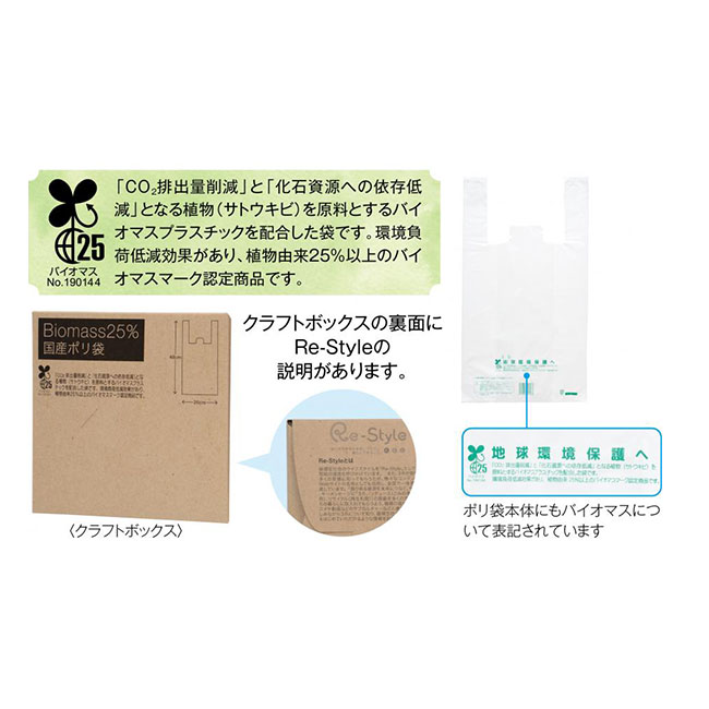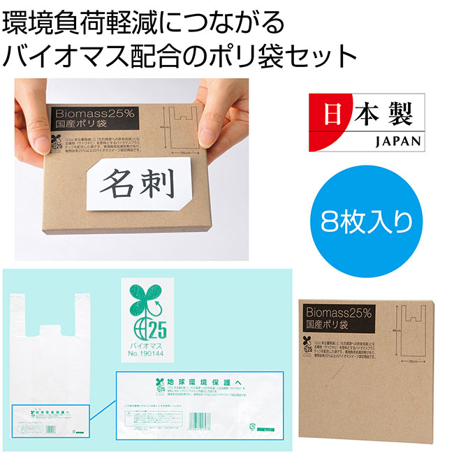 「バイオマス25% 国産ポリ袋8枚」は、環境に優しいバイオマス配合のポリ袋のギフト。環境負荷低減効果のある植物由来25%以上のバイオマスマーク認定商品です。ナチュラル感のあるクラフトボックス入りで、ボックスには名刺をさすことができるのでご挨拶品に最適となっております。レジ袋有料化によりいくつ貰っても嬉しいアイテムで、環境に優しい商品の配布は企業イメージUPにも繋がります。激安価格でご注文可能ですので、展示会ブースの来場ノベルティや、お得意様へのご挨拶回りの粗品などにご活用ください。