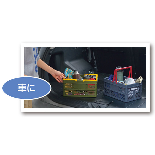 「ハンドル付き折りたたみコンテナボックス」は、ハンドル付きなので持ち運び楽々。アウトドアにはもちろん、車内やリビング、お部屋の収納にも活躍するアイテムです。側面は内側に折り畳み可能なので、未使用時はすっきりコンパクトに収納しておくことができます。おしゃれなカラーリングも魅力ですので、アウトドアショップのポイントノベルティやカーディーラーのご予約特典などにぜひご活用ください。通販ならではの格安価格でご注文頂けます。