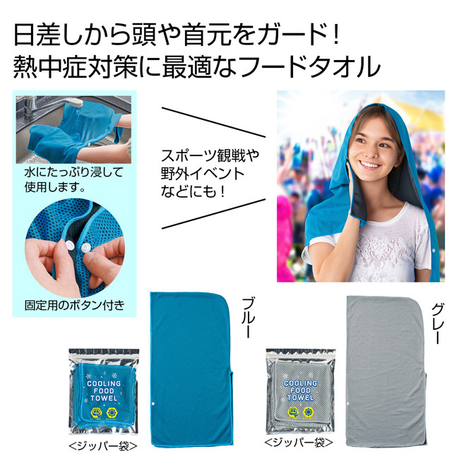 強い日差しと暑さから頭部を守る「さらっと涼感フードタオル1枚」は、熱中症対策に最適なフードタオルです。たっぷりの水に濡らすと心地良い涼感を得られ、汗をかくシーンでのクールダウンに重宝します。ジョギングやスポーツ観戦のように体を動かすアクティブなシーンにもぴったりです。マラソン大会の参加記念品や夏季スポーツウェアの購入特典ノベルティなどに当通販店での格安注文はいかがでしょうか。