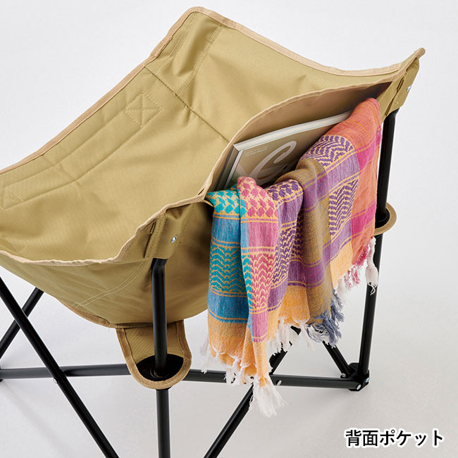 サイドと背面に小物を入れられるポケットが付いた折りたたみ式チェアの「ポケット付きアウトドアチェア」。背中から腰、お尻まですっぽりと包み込むようなホールド感のある形状は、屋外で長時間座る事が多いキャンプにもってこいです。脚部を畳んでスマートに収納可能で。持ち運び用の収納袋も付いています。チェアと収納袋それぞれに名入れスペースがございますので、ブランドロゴや店名などの激安プリント制作がお薦めです。アウトドア用品店の記念品、野外イベントの物販作成などにぜひ。