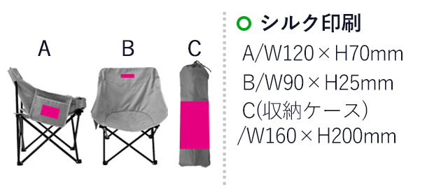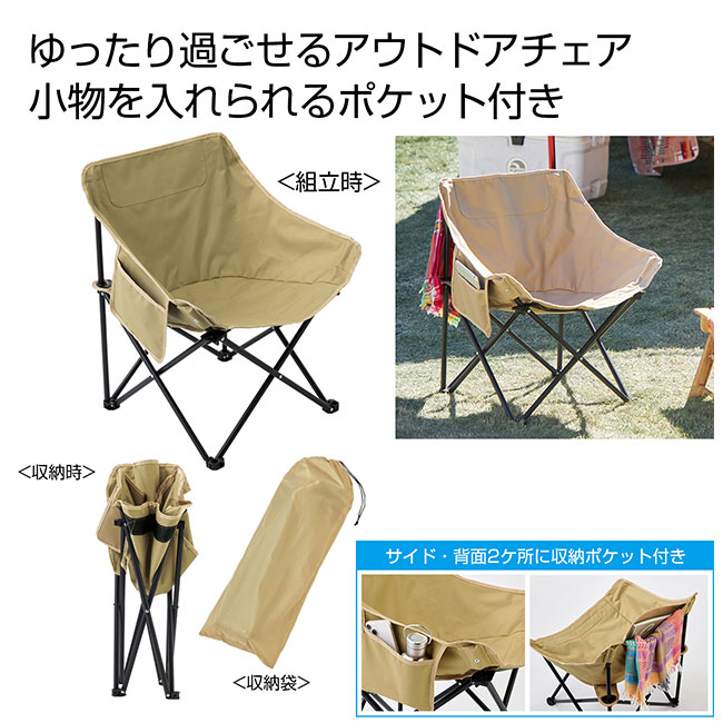 サイドと背面に小物を入れられるポケットが付いた折りたたみ式チェアの「ポケット付きアウトドアチェア」。背中から腰、お尻まですっぽりと包み込むようなホールド感のある形状は、屋外で長時間座る事が多いキャンプにもってこいです。脚部を畳んでスマートに収納可能で。持ち運び用の収納袋も付いています。チェアと収納袋それぞれに名入れスペースがございますので、ブランドロゴや店名などの激安プリント制作がお薦めです。アウトドア用品店の記念品、野外イベントの物販作成などにぜひ。