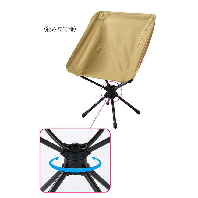 「くるくるリラックスチェア」は、360度向きを変えられる回転式の折りたたみチェアです。座ったまま好きな方向を見られるため、仲間とのコミュニケーションや自然の景色を眺めるといったチルタイムがいっそう快適になります。持ち運びに役立つポーチ型の収納袋が付いているので、レジャーやアウトドアに大活躍。チェアと収納袋には格安名入れ製作を承りますので、アウトドア用品店の物販グッズやカーディーラーの記念品などにいかがでしょうか。