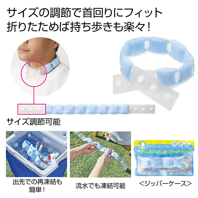 「携帯便利な折りたたみクールネックリング」は、折りたたんでコンパクトに持ち運べるのが画期的なネックリングです。リングの長さは留め具の位置によって調節可能で、大人にも子供にもフィット。約28℃以下で自然凍結するPCM素材を使用しているため、外出先でも水で冷やせば簡単に再凍結します。熱い季節やスポーツ中の熱中症対策に役立つクールグッズですので、野外フェスの来場記念品やスポーツ大会のノベルティなどにオーダーメイド製作してはいかがでしょうか。