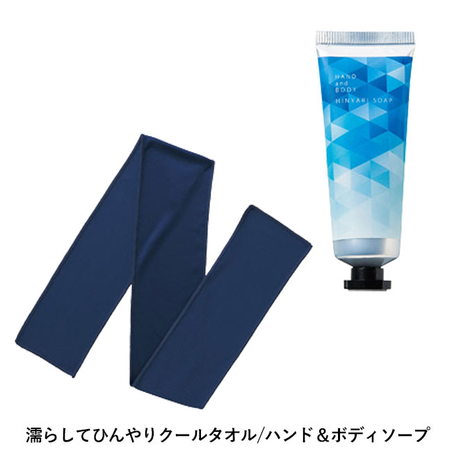 「ひんやりクールセット」は、ギフト感たっぷりな涼し気デザインの化粧箱に入ったタオルとハンドソープのセット。タオルは濡らすだけでひんやりするクールタオルで、スポーツやアウトドアで首に掛けて活用できます。ハンド&ボディソープはひんやりするメントール配合。男女問わず活用できる夏にぴったりのセットですので、アウトドアショップの開店記念品や美容サロンの入会ノベルティなど、幅広いシーンでご活用ください。