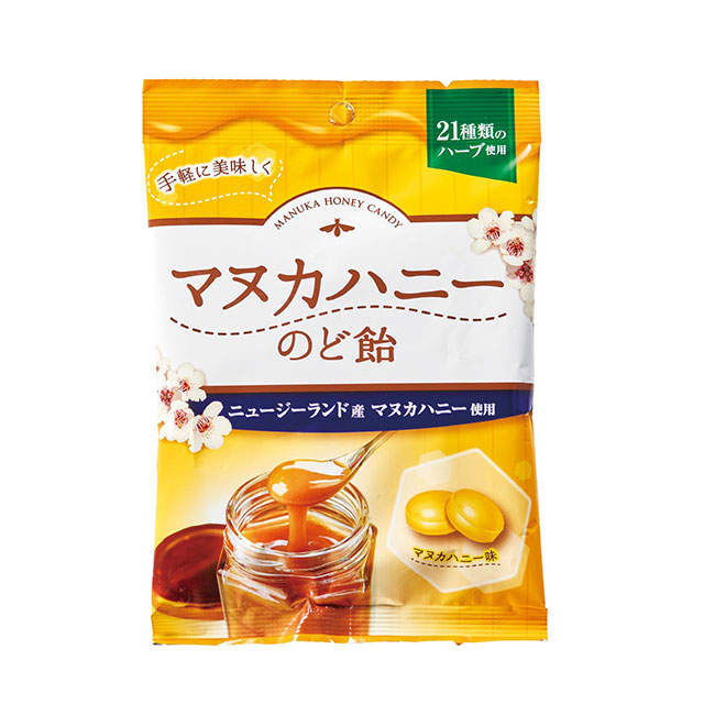 「21種類のハーブを使用 マヌカハニーのど飴」は、ニュージーランド産のマヌカハニーを使った美味しいのど飴。風邪予防やのどの痛みへの手軽な対処にお薦めです。デザイン袋入りで貰って嬉しい商品ですので、ドラッグストアなどの〇円以上購入特典や、来店で貰えるキャンペーン景品にいかがでしょうか。激安の値段でご注文頂けますので、ぜひ当ノベルティ・ギフトモールをご利用ください。