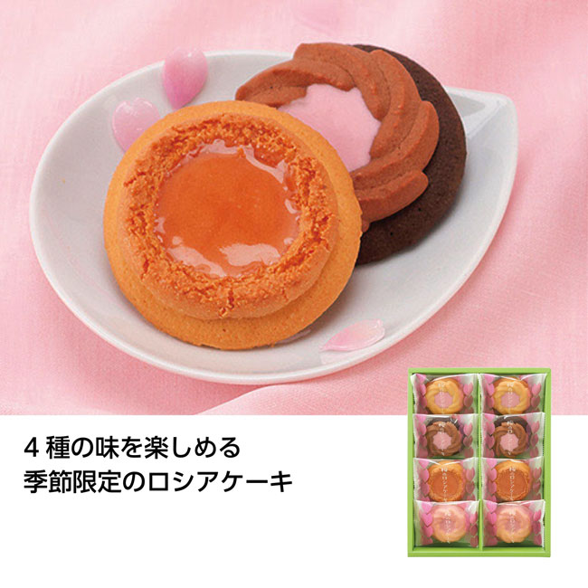 「桜のロシアケーキ8個入」は、プレーン・チョコ・マカロン・ココアの4種の味が楽しめるロシアケーキ。華やかな桜のケーキは春ギフトにぴったりです。たっぷり8個入りで満足感があるセットなので、新年度のご挨拶品やイベント景品などにいかがでしょうか。通販専門店ならではの激安の値段でご注文可能ですので、ぜひ当ノベルティ・ギフトモールをご活用ください。