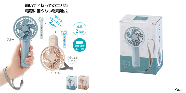 「2WAYシンプルファン」は持ち手にオリジナルプリントを印刷できますので、社名やブランドロゴを名入れすればハンディファンとして使用したときに企業のPRになります。本体はベージュとブルーの2色取混ぜで、パッケージから中身の色を判別可能です。