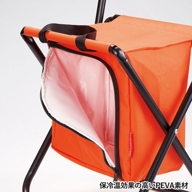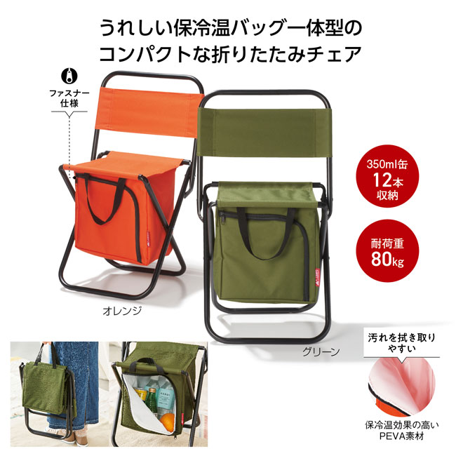 「キャンプス 保冷温バッグレジャーチェア」は、保冷温バッグ一体型のコンパクトな折り畳みチェア。座る部分が保冷温バッグになっています。320mlの缶ビールが12本入るほどの大容量で、レジャーやアウトドアに最適です。バッグ部分には持ち手が付いているため、椅子を折り畳んで持ち運ぶときもスムーズ。明るい印象のオレンジとカーキは、2色取混ぜで納品いたします。背もたれにはブランド名やロゴの激安名入れが可能ですので、キャンプイベントの記念品やポイント交換ノベルティにお薦めです。