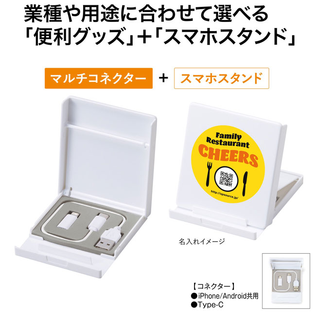 スマホの充電に便利なコネクターとケーブルが入った「コネクターセット&スマホスタンド」は、ケースをスマホスタンドとして活用できます。充電にも動画視聴にも役立ち、外出先でも快適にスマホが使える優れものです。ケースの名入れスペースは大きく、スマホスタンドに変形させたときにプリント面が見えるようになっています。イラストやショップロゴを名入れし、雑貨店やモバイルショップで配布するノベルティの格安製作にいかがでしょうか。