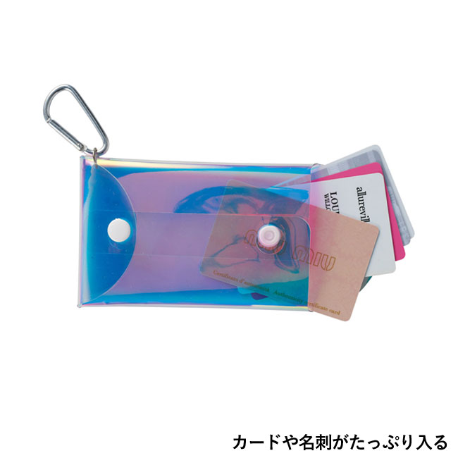 「シャイニング オーロラポーチ」は、光の角度によって七色に光るオーロラカラーのビニールポーチになります。カラビナが付いているので、イヤホンやリップ、お菓子などちょっとした小物を持ち運ぶのに便利です。中身がほんのりと見えたり隠れたりするため、推し活グッズの持ち歩きにも好まれております。格安価格の本体には表面または裏面に名入れができますので、店舗ロゴやイラストのオリジナル印刷でお洒落なノベルティを作成する事が可能です。