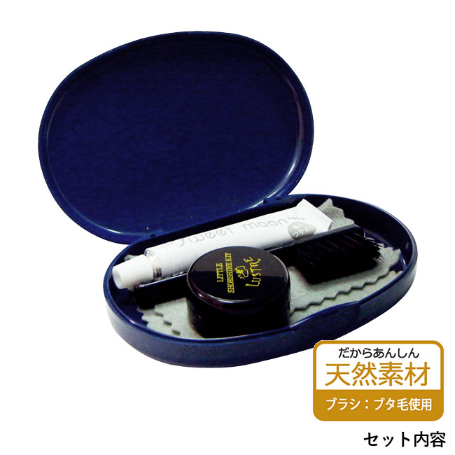「ラスタ」はコンパクトなケースの中に靴の手入れに必要なブラシやクリームを入れた5点セットになります。持ち歩きに便利な靴磨きセットは、家だけではなく出張先でも活躍すること間違いなし。男性に喜ばれるアイテムですので、革靴のお買い上げ特典に効果的です。ケースとクリームのフタに名入れができますので、メーカー名やロゴを入れて訴求力のあるノベルティとしてご活用くださいませ。