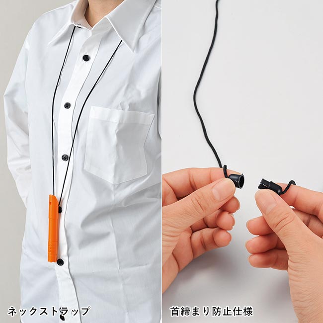 ライト・ボールペン・ホイッスルの三つの機能が一つになった防災・防犯グッズ。首からかけれるストラップは締まり防止の為に引っ張ると外せると言う優しい構造になっております。名入れ面に社名などがお薦めです。