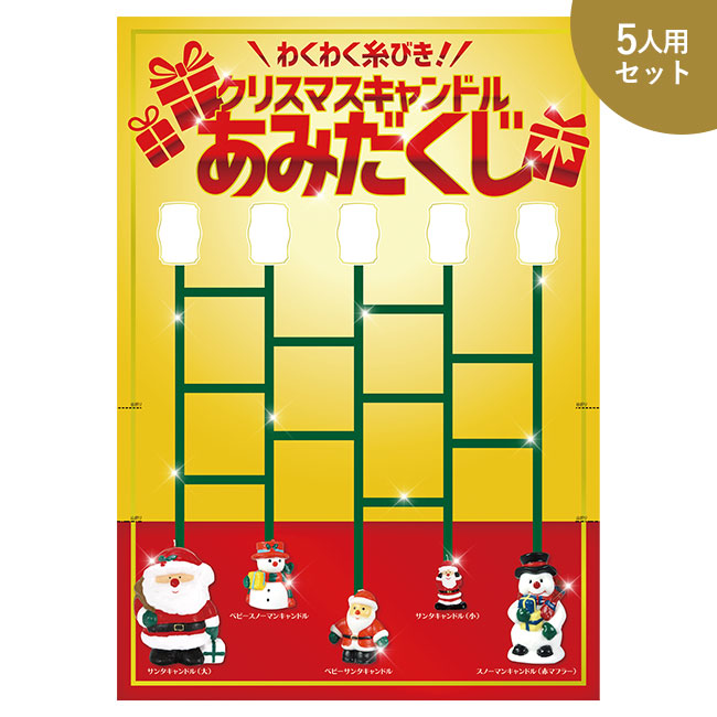 かわいいクリスマス用のキャンドルが賞品の「キャンドルあみだくじ5人用(A)」。少人数で楽しめる5人用あみだくじなので、密集しないクリスマスイベントを行うことができます。サンタやスノーマンのかわいいキャンドルは飾りとしても華やかで、大人から子供まで楽しめるアイテムです。クリスマスパーティーやショップイベントなどのノベルティとしてぜひご活用ください。格安価格で発注を承っております。