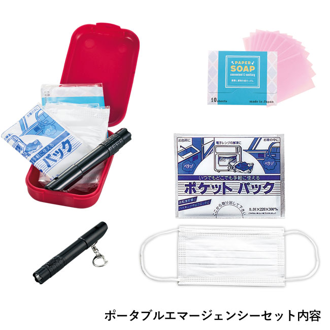 災害時に役立つ「ポータブルセット」は、絆創膏や包帯等が入った「エイドチーム」と、ロウソクやホイッスルライト等が入った「ポータブルエマージェンシー」のセットになります。成約キャンペーン特典や、○周年と日頃からご愛顧して下さるお客様に配布をする記念品など、様々なシーンでお勧めの防災グッズです。