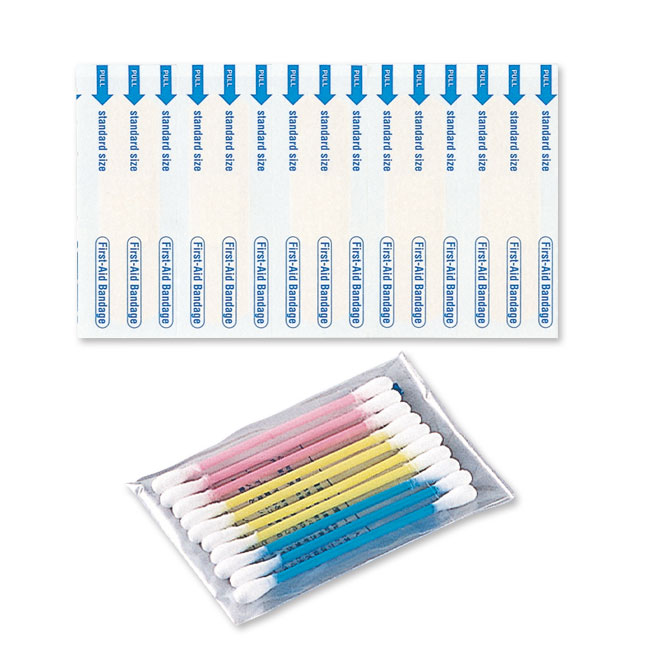爽やかなブルーのパッケージのファストエイドセットは、綿棒と絆創膏の激安セットになります。コンパクトなサイズ感となっており、イベントや店頭など配布する場所を選ばずにノベルティとして使用が出来ます。またPP袋に入っているので既存商品へのベタ付け商品としてもお薦めです。