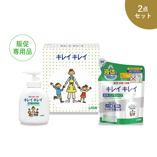 キレイキレイ本体と詰め替えパックの2点が入った販促ギフト。小さなお子様やご年配がいる家庭にも嬉しいハンドソープセットは、商店街やスクールの行事で景品、粗品にぴったりの販促専用品です。