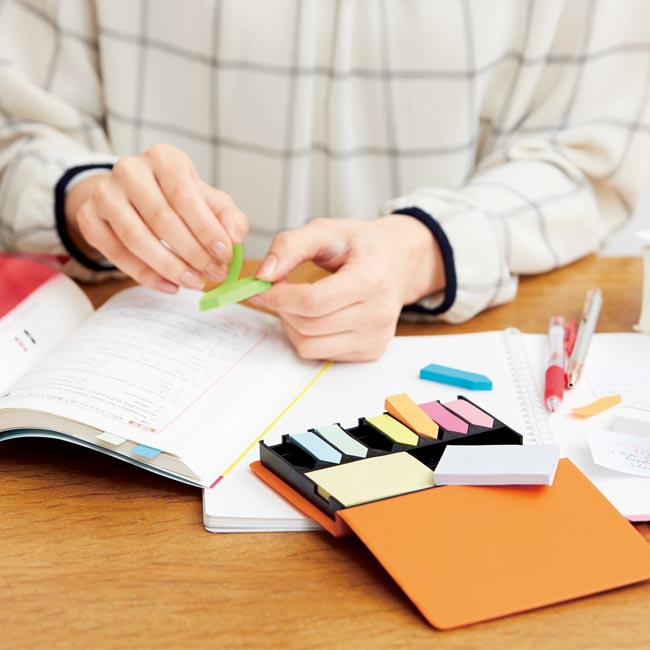貼ってはがせるふせんメモとカラフルな矢印型ふせんのセット。卓上サイズで家族やオフィスの皆で使え、矢印型ふせんは注釈等で指している場所が分かりやすく便利。化粧箱入りで販促品にも最適。
