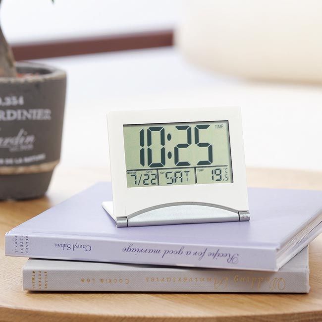 アルミ質感がクールな多機能卓上クロック。アラームやカレンダー、温度計等5つの機能付きでギフトプレゼントにも最適な販促グッズ。折りたたみ収納で出張カバンに入れたいデジタル時計です。