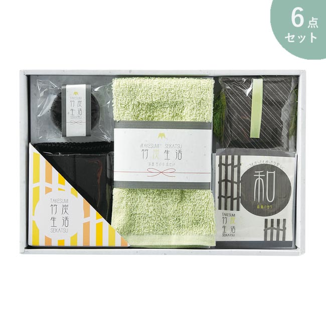 お風呂で楽しめる竹炭グッズも入った6点ギフトセット。竹炭配合石鹸や入浴料など、日々の暮らしにちょっとした安息を与えてくれる心配りの、優しい販促ギフトです。