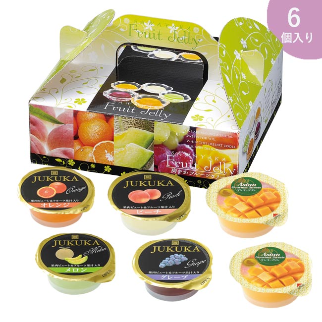 フルーツゼリー4種と人気のマンゴープリン2個が入った計6個のギフトセット。手提げボックス入りで販促ギフトにも最適な、美味しい販促グッズです。イベントやフェアで景品にも。