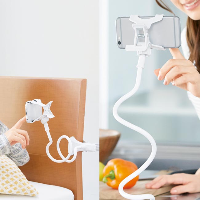 最長73cmのフレキシブルアームに最大約90mm幅までのスマホなどを挟んで固定できるロングクリップ。居間の机に、寝室の枕元に、キッチンの調理台にと色々な場所に留められる便利なクリップ。