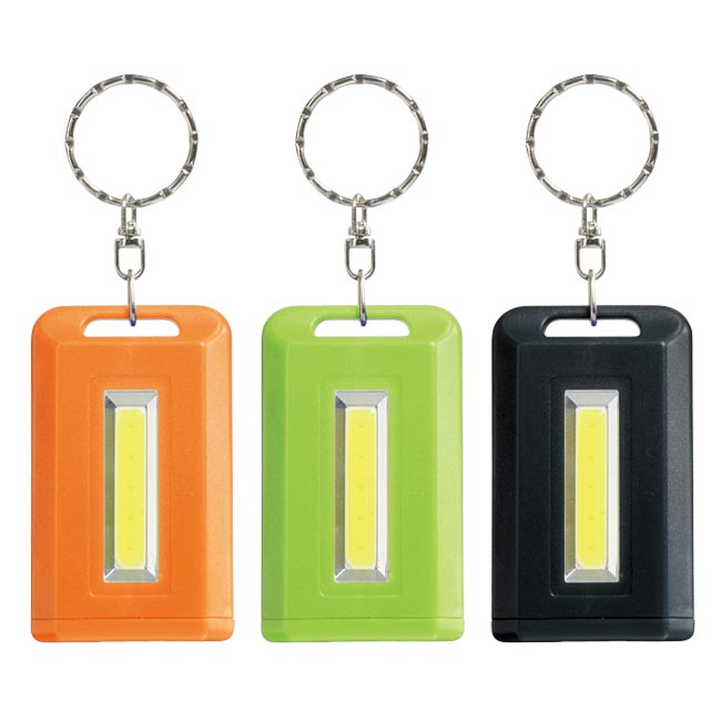 キーチェーンタイプのCOB式のコンパクトなライト。キーチェーンは車や家の鍵と一緒にすれば暗い手元を照らせて便利です。カーショップや不動産などで名入れのノベルティ利用が効果的です。
