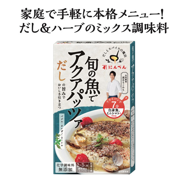 「だしとスパイスの魔法 旬の魚でアクアパッツァ」は、だしとハーブのミックス調味料。魚介の旨みにオレガノ・バジルの香りが食欲をそそるアクアパッツァを、ご家庭で簡単に作ることができます。時短料理に役立つ当商品は、主婦向けのギフトにぴったり。調理家電の購入ノベルティや、ワインの試飲イベントの参加記念品などにご活用頂けます。格安価格でご注文を承っておりますので、ぜひご注文ください。