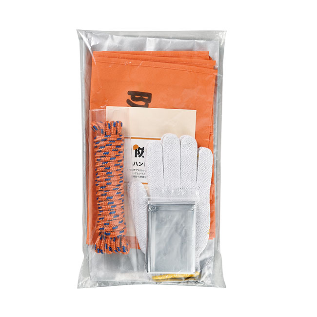 防災セットは安全・安心・便利を考えて揃えた持出袋付きの防災5点セットとなっておりオフィスやご家庭などで常時置いておけます。イベントでお客様に直接お渡しする際は中にお渡し用の不織布バッグが入っているので受け取る側も負担にならずに受け取れます。プリントなどオリジナル製作は出来ませんが災害対策としてインパクトのあるギフトをお考えの方にお薦めです。