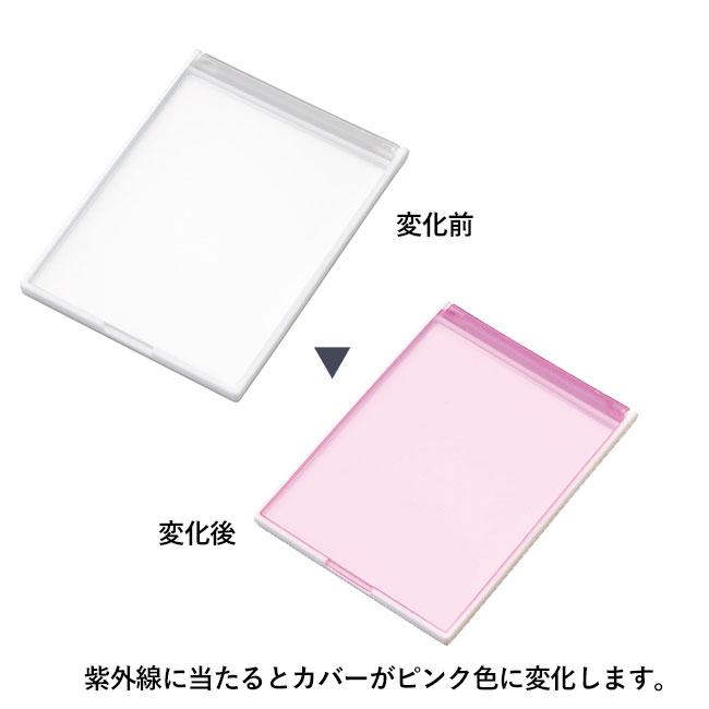 NewUVチェックミラーは紫外線があたるとカバーがピンク色に変化する優れもの。紫外線のチェックが出来るので女性に人気のノベルティとなっております。ノーデザインなのでロゴや社名が綺麗に映えます。美容室を利用された方やオリジナルのヘアセットグッズとしてオススメです。