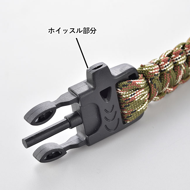 ほどくとロープとして使用でき、火おこし機能やホイッスル機能を有し災害時や緊急時に役立つパラコードブレスレット。社名を入れて防災関連の展示会でのバラマキ景品などのノベルティとして活用されております。独自性の高いクリエイティブな製品を低価格なお値段で製作出来ますので、競合他社との差別化を図る事が出来る製品です。