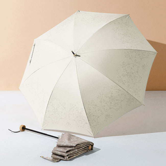 グレーとオフホワイトの2色アソートで上品な「フローラルレース・晴雨兼用長傘」。派手過ぎないレース柄が大人向けな印象で、年齢層の高い女性でも持ちやすいアイテムです。持ち手部分も高級感のある落ち着いた作りとなっています。ショップの開店記念品など特別感のあるギフトにいかがでしょうか。